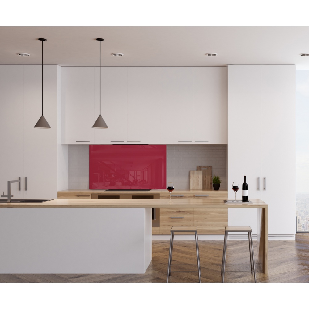Mur Cuisine Couleur Rouge Groseille. La couleur rouge est une couleur chaude contrairement au bleu, par exemple, qui est considéré comme une couleur froide. Elle est rouge brillante, le plan de travail est gris, l'électroménager est en inox, et le carrelage au sol est gris souris.